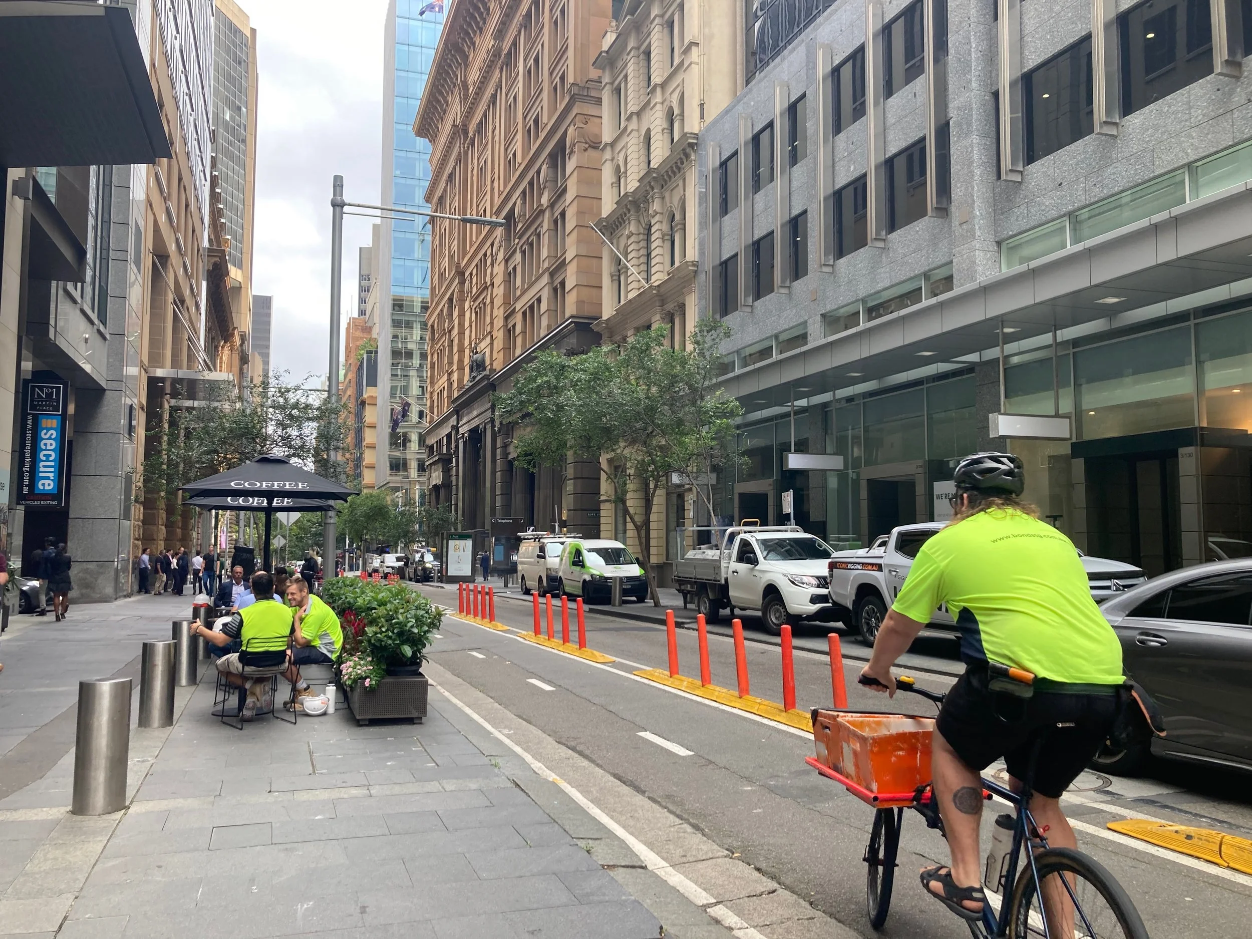 Image: Cargo freight delivery rider on the Pitt Street pop-up cycleway during COVID19. Photographer: Jullietta Jung