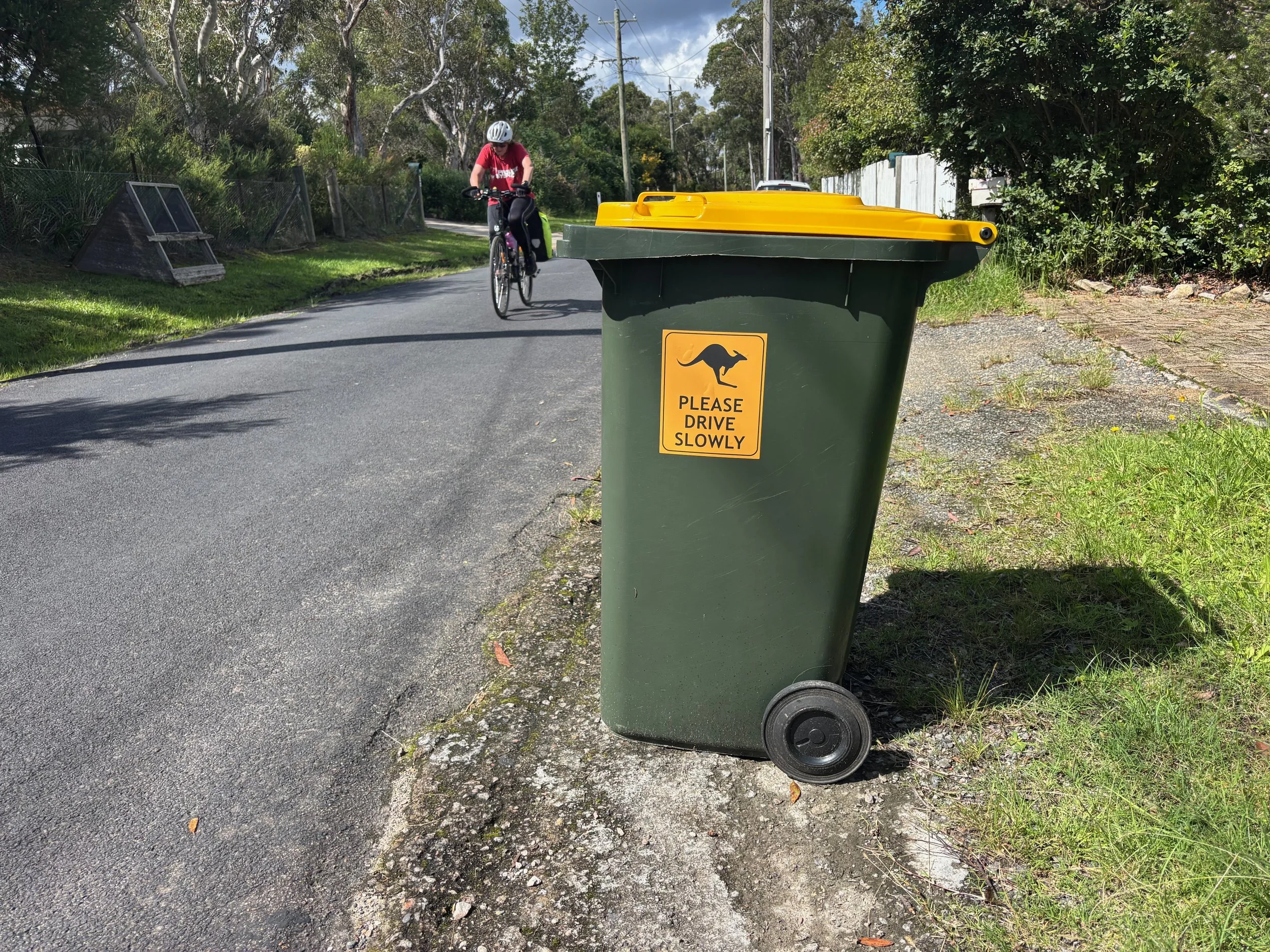 Photo: Wheelie bin sticker “Please Drive Slowly” in the Blue Mountains, New South Wales. Photographer: Jullietta Jung